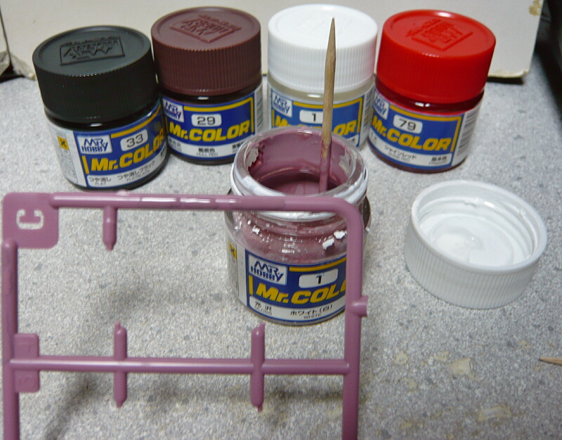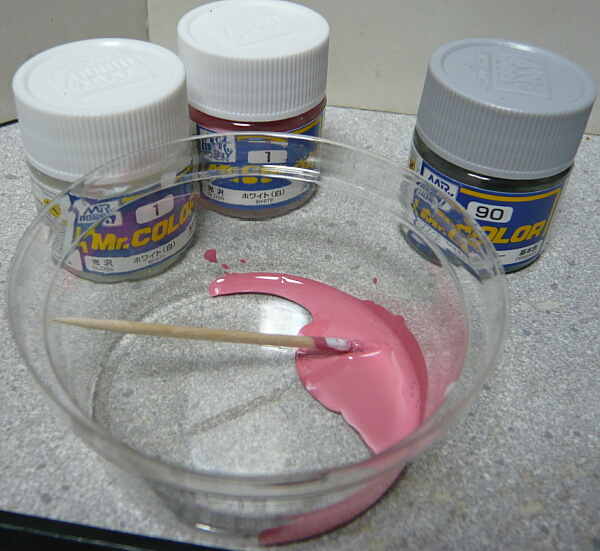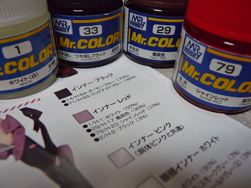 ただし部分塗装にとどめる場合は成型色に合わせるため、説明書の配合と割合が違う事があります。インナーレッドは説明書の配合より白が少な目だったのか、1ホワイトが多少残ってる瓶に色を投入していったら大量にインナーレッドが出来上がってしまいました。
