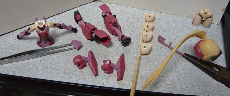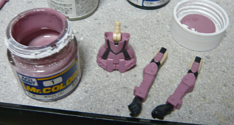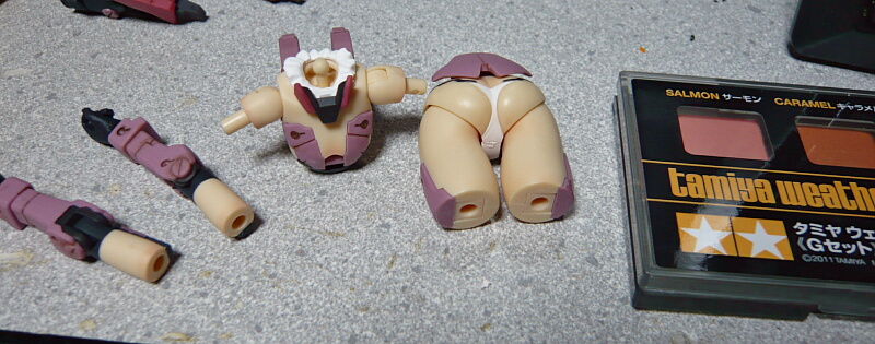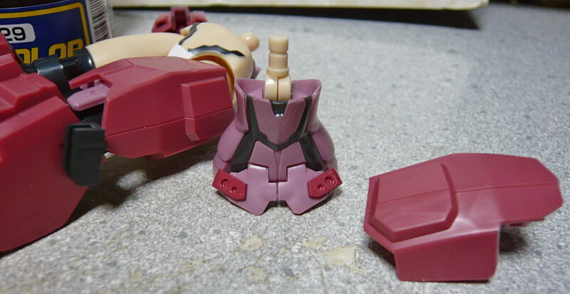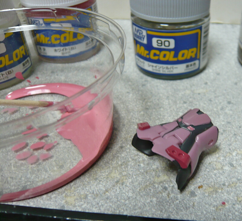 胴体ピンクは腹前後の目みたいな部分ですが、説明書によるとシルバーを塗ってその上にクリヤーピンクを塗るという要領のようです。面倒ならただのピンクで十分。