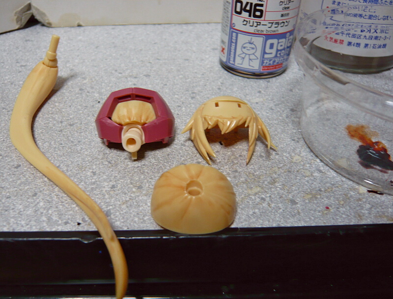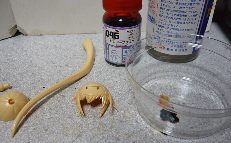 髪はいつも通り影になる色を作ってうすめ液でシャバシャバにしてスミ入れウォッシングの要領で塗ります。ガイアカラーの046クリアーブラウンが丁度良さそうだったので早速うすめ液でシャバシャバにして使用。やっとまともな出番が出来たわこの色。