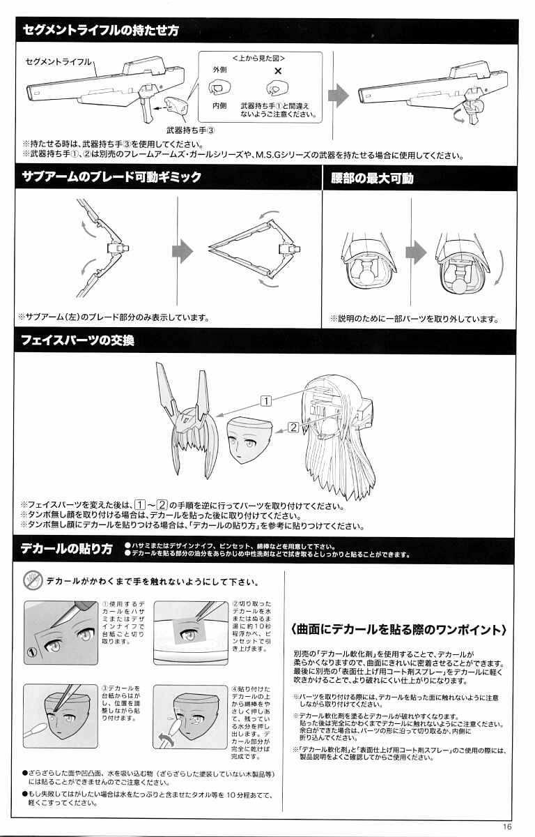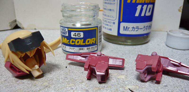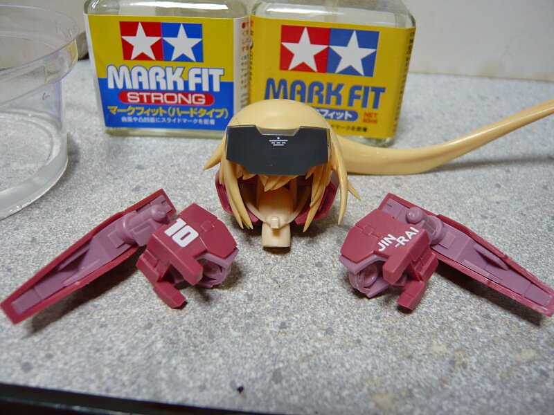 デカールは最低両肩前面と額の3か所に貼りますが、成型色無塗装の上に貼っても定着しにくいのであらかじめクリヤーを薄く塗っておきます。