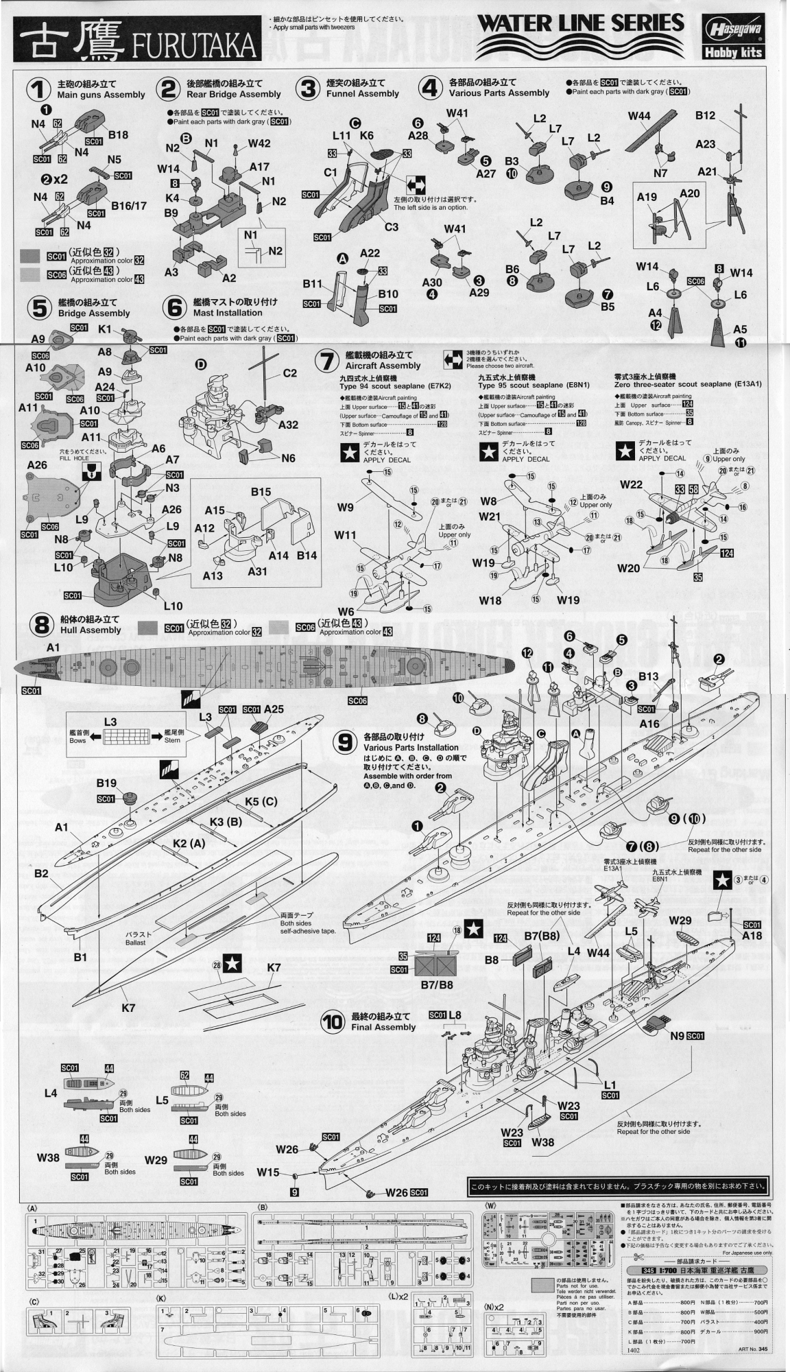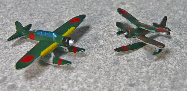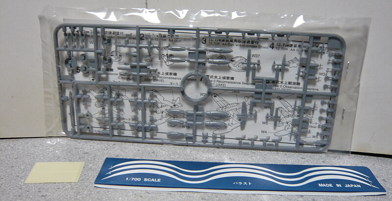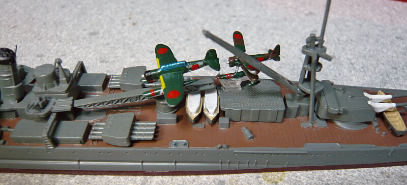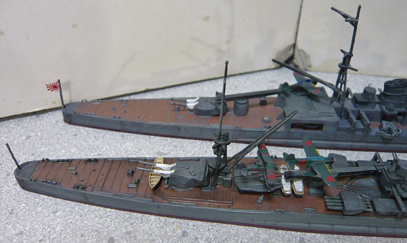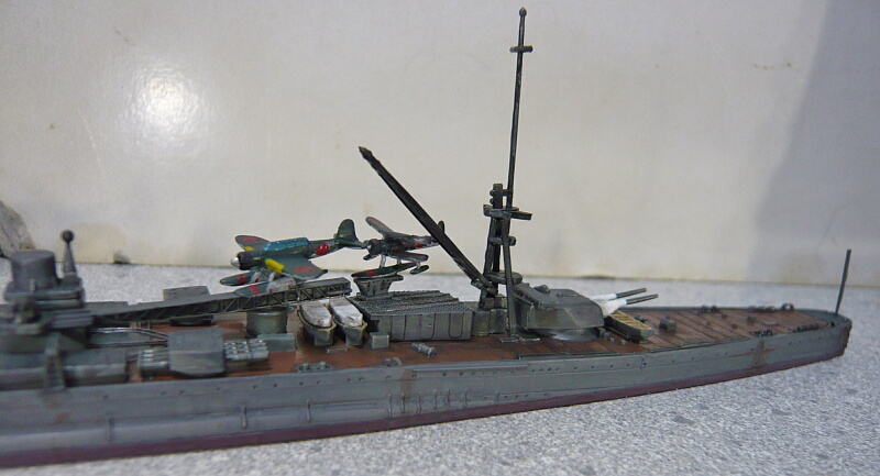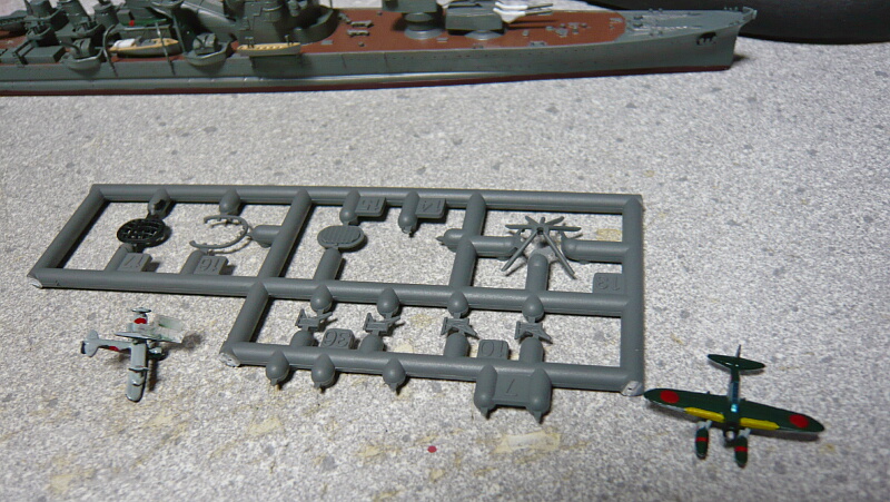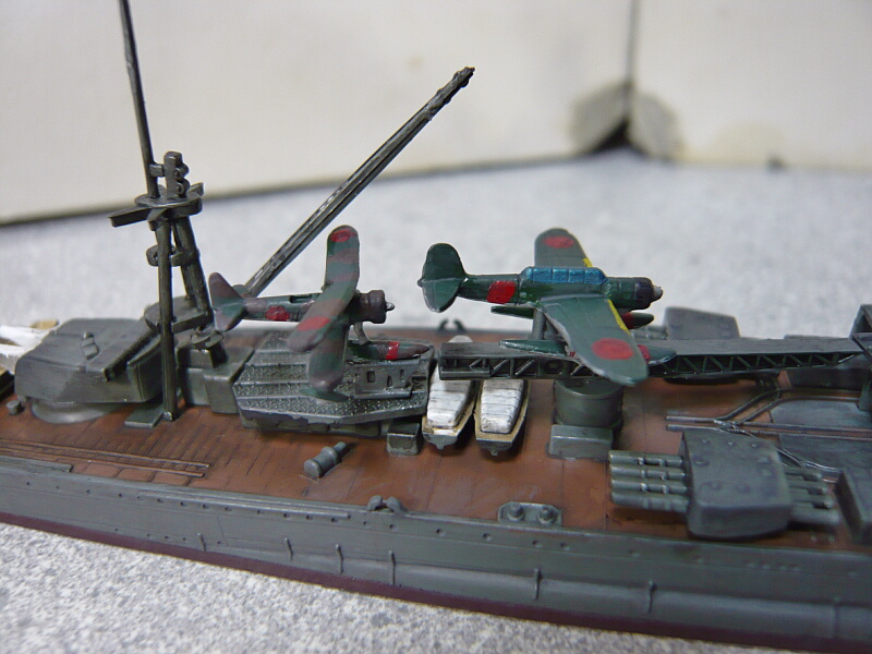 搭載機は定数2機で、九四式水上偵察機・九五式水上偵察機・零式三座水上偵察機の3機種から2機種を選択するようになっています。説明書だと九五式と零式水偵推奨っぽいのでその2つを組みましたが、実艦の写真では九四水偵2機が多いような・・・