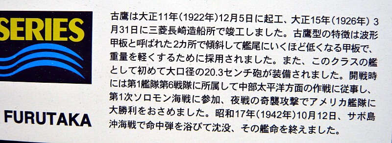古鷹は古鷹型重巡洋艦の1番艦。米海軍のオマハ級軽巡洋艦(排水量7200t・152mm砲12門)に対し日本の5500t型軽巡洋艦(14cm砲7門)では対抗できないとして、オマハ級と同等の排水量に20cm砲6門を搭載する艦として計画されました。設計には5500t型と同時に実験的に建造された軽巡洋艦「夕張」のコンセプトが生かされており、小型の船体に重武装という点も同様でした。日本海軍では7000tを境に上を一等巡洋艦、下を二等巡洋艦と分けており、7000tを超える艦となるため一等巡洋艦として「古鷹」「衣笠」が計画されましたが、川内型二等巡洋艦でキャンセルとなった「加古」が繰り上げとなって1番艦となり、当初は「加古型一等巡洋艦」として1922年11月に起工、古鷹も12月に起工します。(衣笠は一旦キャンセルされ、後に青葉型の2番艦となります)そして1926年に竣工間近だった加古は事故により竣工が遅れたため、古鷹が先に1926年3月31日に竣工、何故かこの時は先に竣工した艦を1番艦とする取り決めがされ、加古型改め古鷹型とし、古鷹は古鷹型の1番艦となりました。