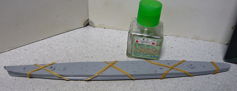 接着後、輪ゴムで縛ったところ。そこそこ大きいので当て板をしなかったせいかわずかに船体中央底面が浮いてしまっています。