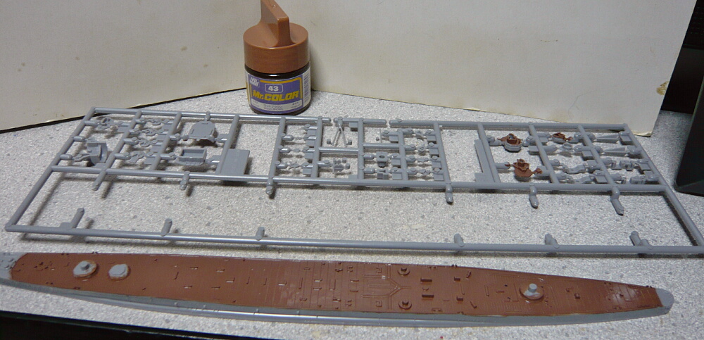 リノリウム色として43ウッドブラウンを塗装。艦橋にもリノリウム色指定の場所があるのでそこも塗装しますが、5層目の屋根部分もリノリウム色でいいの?他の人の作例見ると塗ってあるか、艦橋全部リノリウム無しかどっちか。どうせ実艦のカラー資料なんて無いので好き好きにやればいいのですが・・・