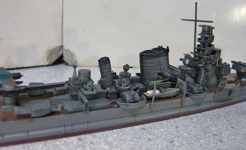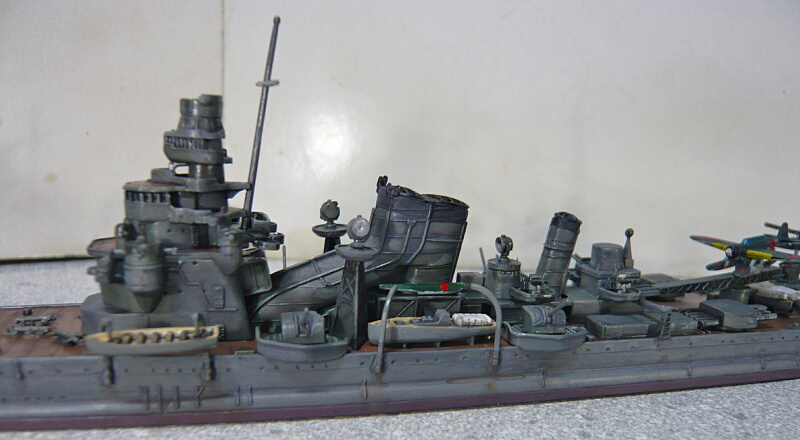 魚雷は当初一二式61cm連装舷側発射管で12門(どういう積み方だったのかググってもよくわからない…)でしたが射界に問題があったため九二式61cm4連装魚雷発射管1型を2基8門に換装、発射管の前には次発装填装置も見えます。その後方中央には航空艤装があります。