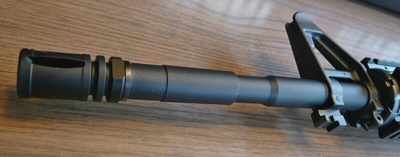 眺めてみましょう。アウターバレルは当然金属製で、というか樹脂の部分がグリップとストックくらいしかありません。ハイダーは14mm逆ネジでイモネジ固定にはなっておらず、ハイダーの穴位置はちゃんと上になっていますが少し緩くて、更に締め込むとハイダーの穴位置が横になってしまいます。シム代わりにゴムのOリングで締め込みの微調整がされています。