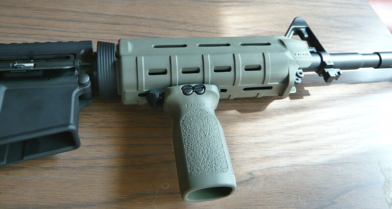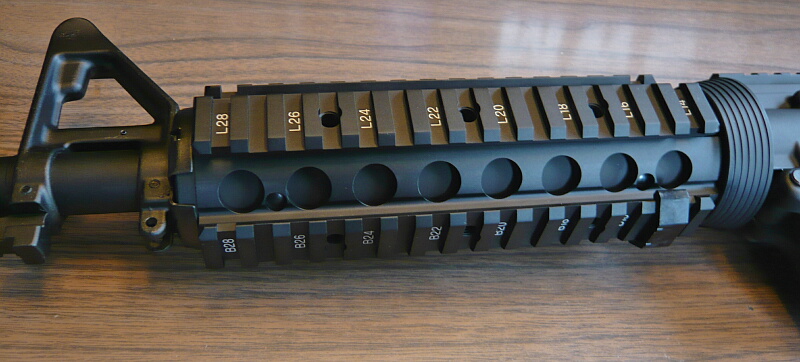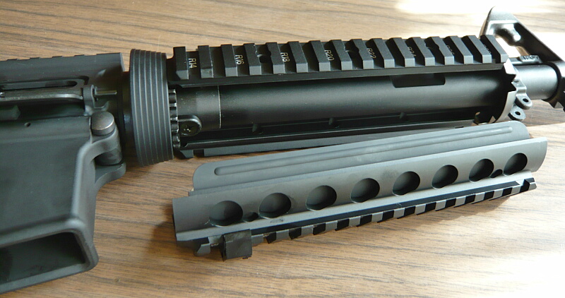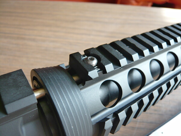 標準のレイルハンドガードはネジで留めている部分の後端がデルタリング側に刺さるような形なので他のリアルサイズのM4には取りつかないかもしれません。