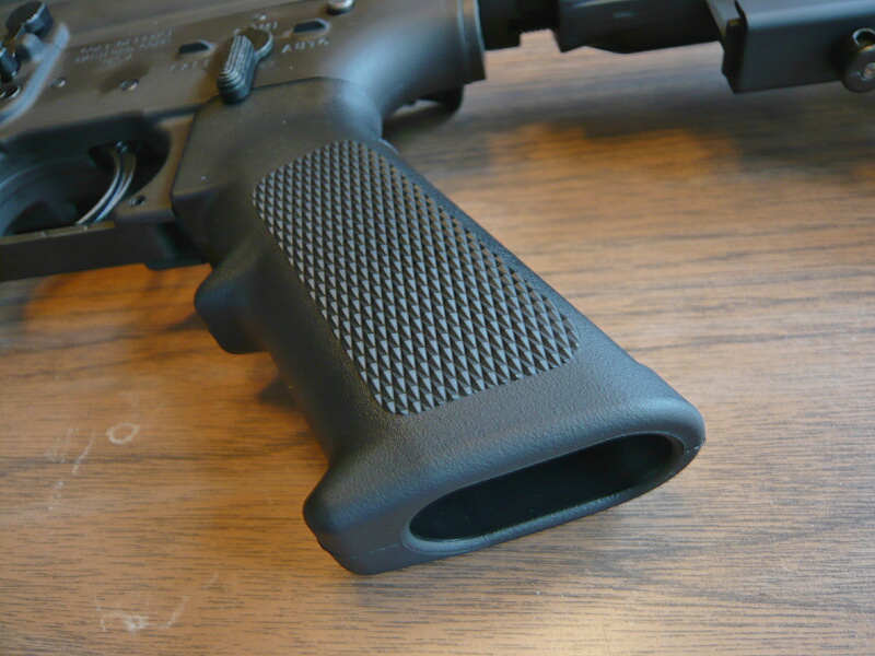 グリップは樹脂製でフィンガーチャンネルのあるA2タイプ。電動ガンのA2タイプと較べるとかなり細く感じます。