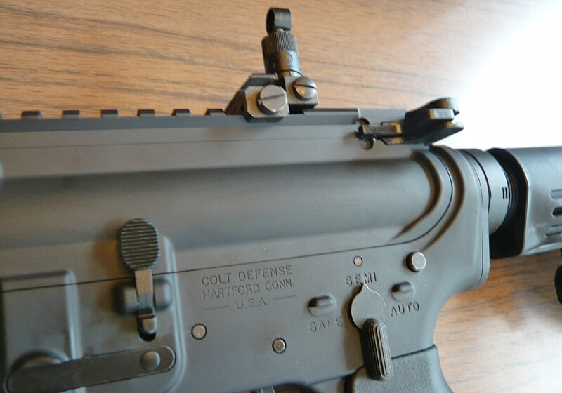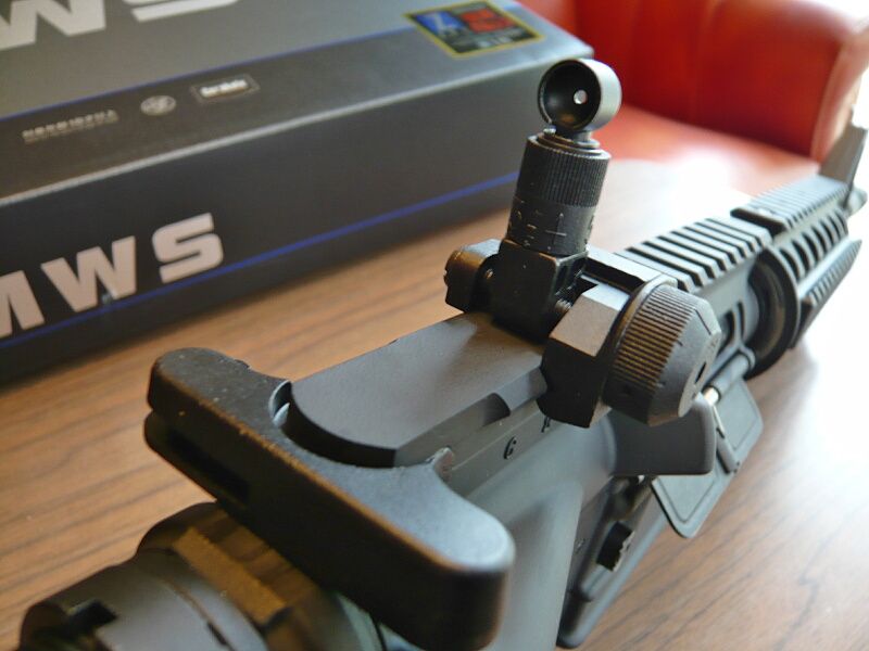 レシーバー上のレイル後端にはフリップアップタイプのリヤサイトが取り付けられています。
