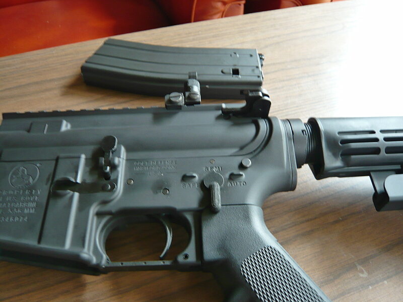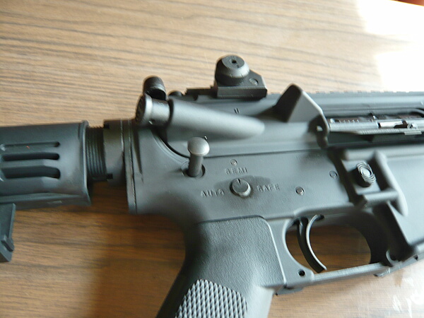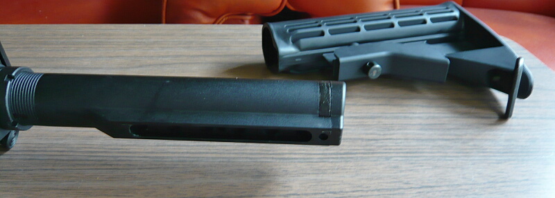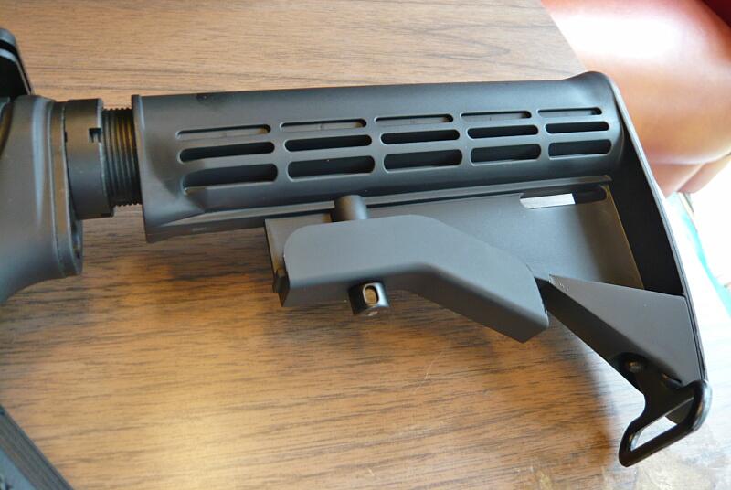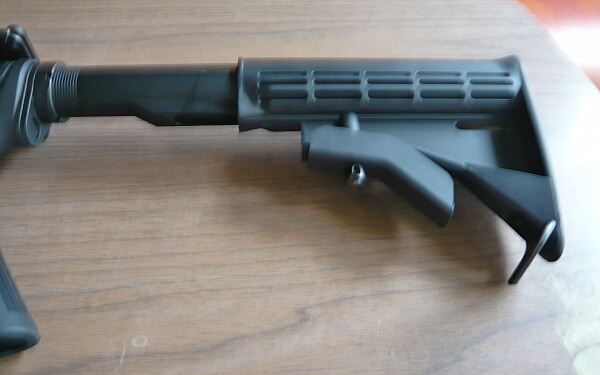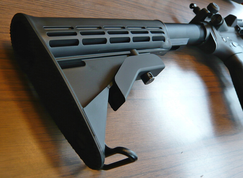 ストックもついでに。標準のブッシュマスタータイプは下のレバーを下に引っ張りながらストックを後方へ引っこ抜く事ができます。