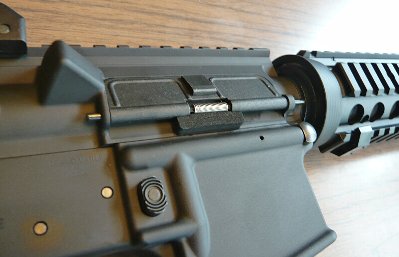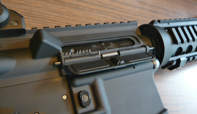 カバーを閉じたところ。チャージハンドルを引くとボルトの後退に連動して自動的にカバーがひらきます。カバーの蝶番の下にクッションが貼られていますが、これカバーが勢いよくレシーバーに当たって傷が付くのを防ぐ初期保護用のもので、剥がしても構わないでしょう。お好みで。