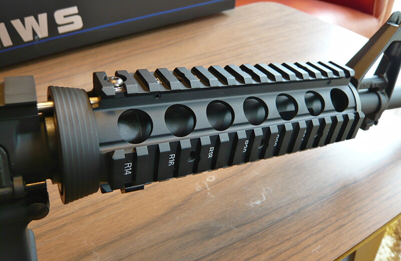 フロントサイトはおなじみの固定A字型で、スリングスイベルはありません。サイトは付属の調整ツールで微調整ができるようになっています。その後ろにハンドガードキャップがあり、レシーバー前のデルタリングとの間には4面レイルのハンドガードが挟まっています。