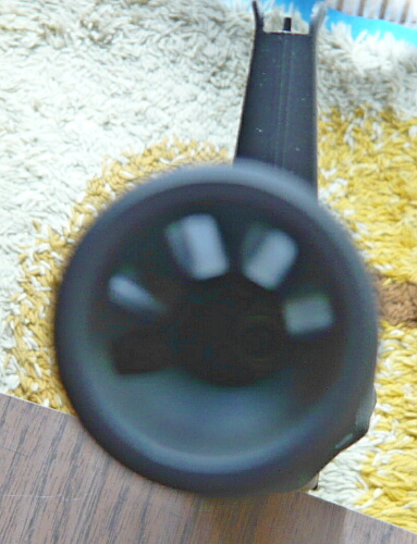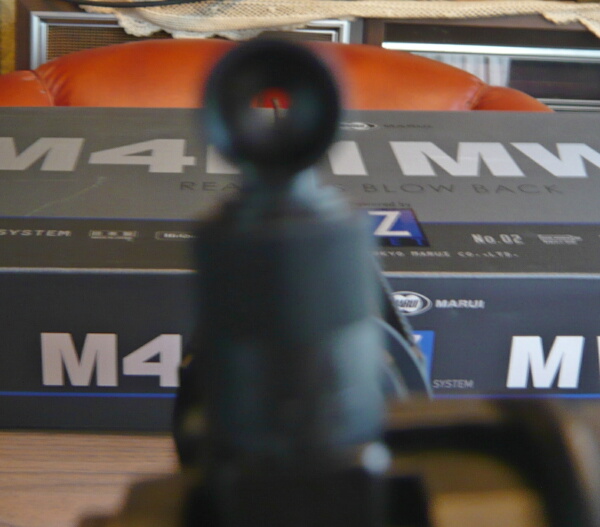 サイトの見晴らし。ピントがちゃんと合っていなくて見づらいですが、実際にはピープの穴を通してフロントサイトを見て照準します。ハンドガンなどのサイトに慣れきっているとピープサイトは少し使いにくく感じるかもしれませんが、これは慣れ次第。