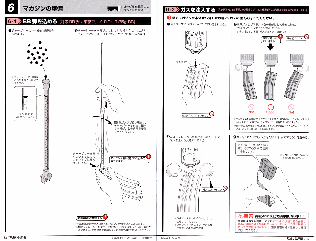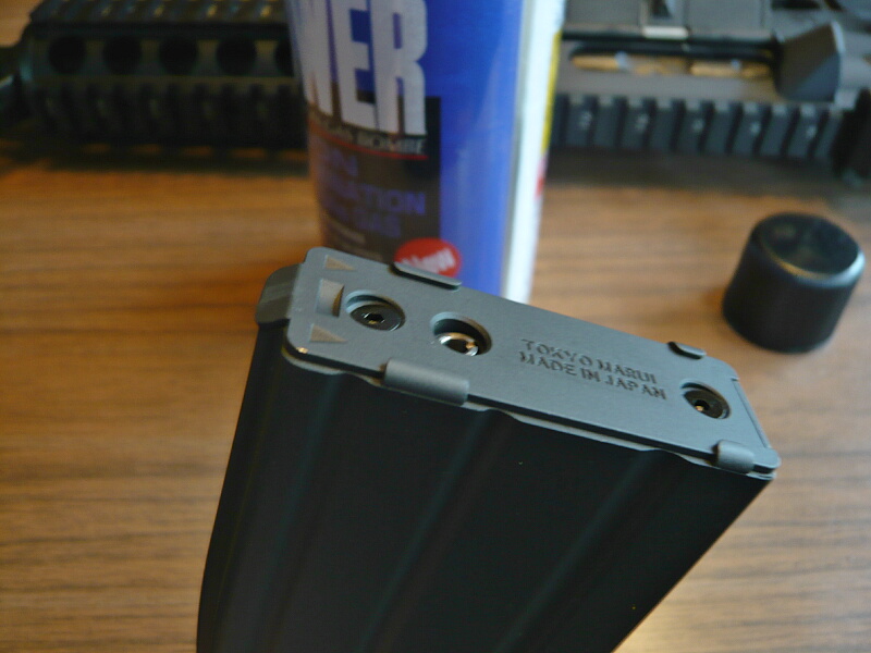 マガジンにガスを入れます。マガジン底部に注入口がありますが、バルブは少し傾いているのでマガジン底部に対し垂直にではなく、バルブに対して垂直になるようにガス缶のノズルを差し込みます。