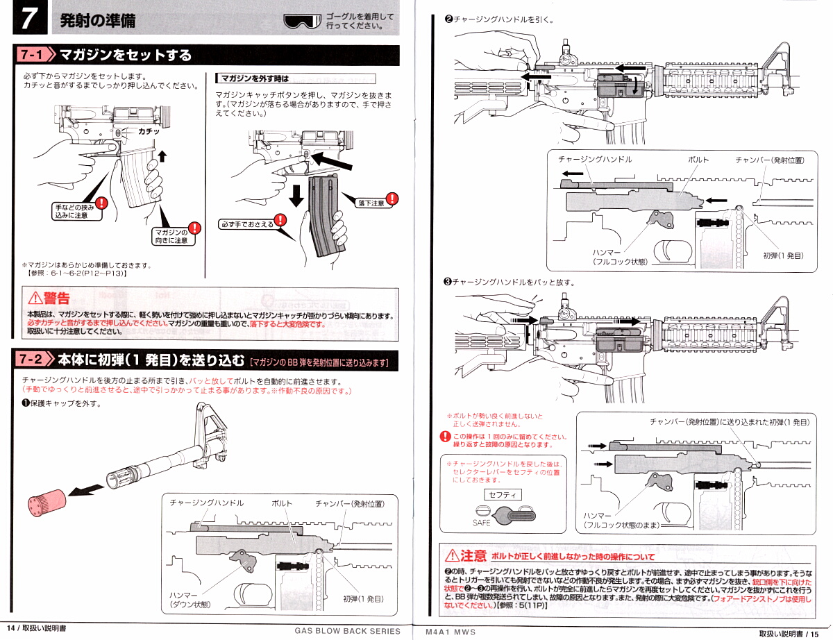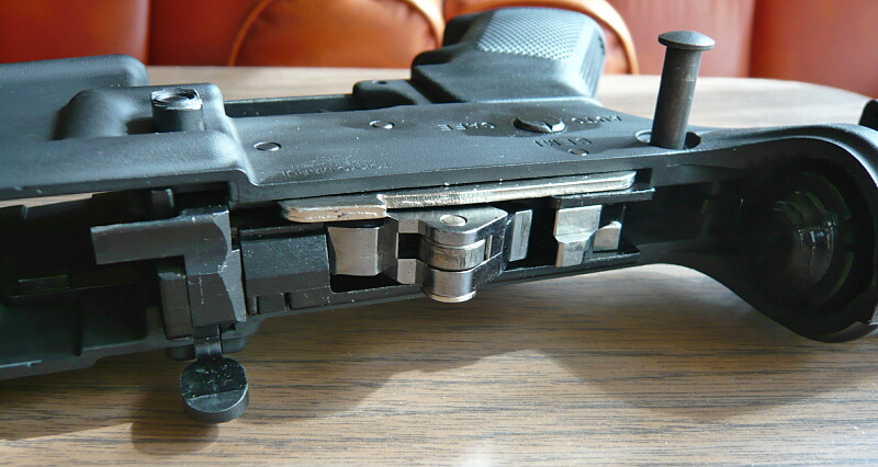 前述のように空マガジンを挿してチャージハンドルを引くとボルトストップが掛かってチャージハンドルは手を離しても前進せず、前後にブラブラになります。