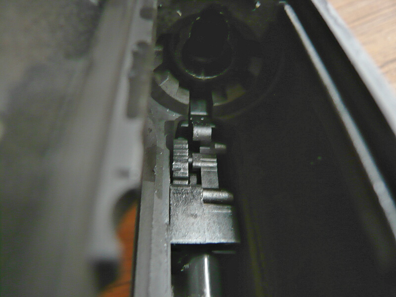 チャージハンドルとボルトアセンブリを取り出したアッパーレシーバー内には前方にホップ調整ダイヤルがあります。ダイヤルにはクリックがあり、銃の前方向に回すとホップが弱まり、後ろ方向に回すと強まります。