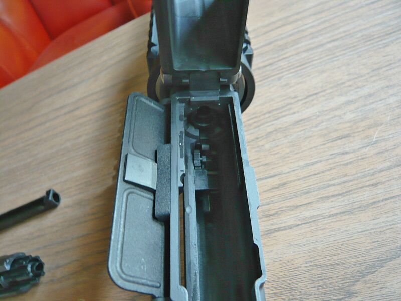アッパーをゆっくり閉めようとするとボルト後端とリコイルバッファの頭が当たって引っ掛かるので、ガチャッと勢いよく閉めてしまいます。