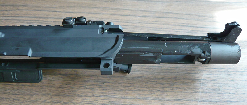 銃口を覗いたところ。インナーバレル前端はフロントサイト前端辺りまでで、インナーバレル長は250mmのようです。