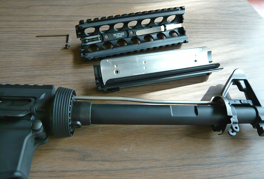 さて折角なのでハンドガードもちょっと外してみましょうか。下半分はレシーバー前のデルタリングを後ろへ引っ張りながらハンドガード下半分の後端を下へ逃がすと外れます。