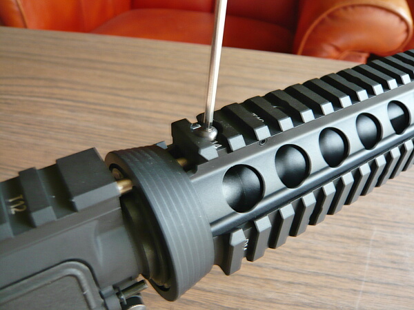 上半分は上面後端のネジで固定されているのでこのネジを外し、デルタリングを後方へ引っ張りながらハンドガード上半分の後端を上に逃がすと外れます。