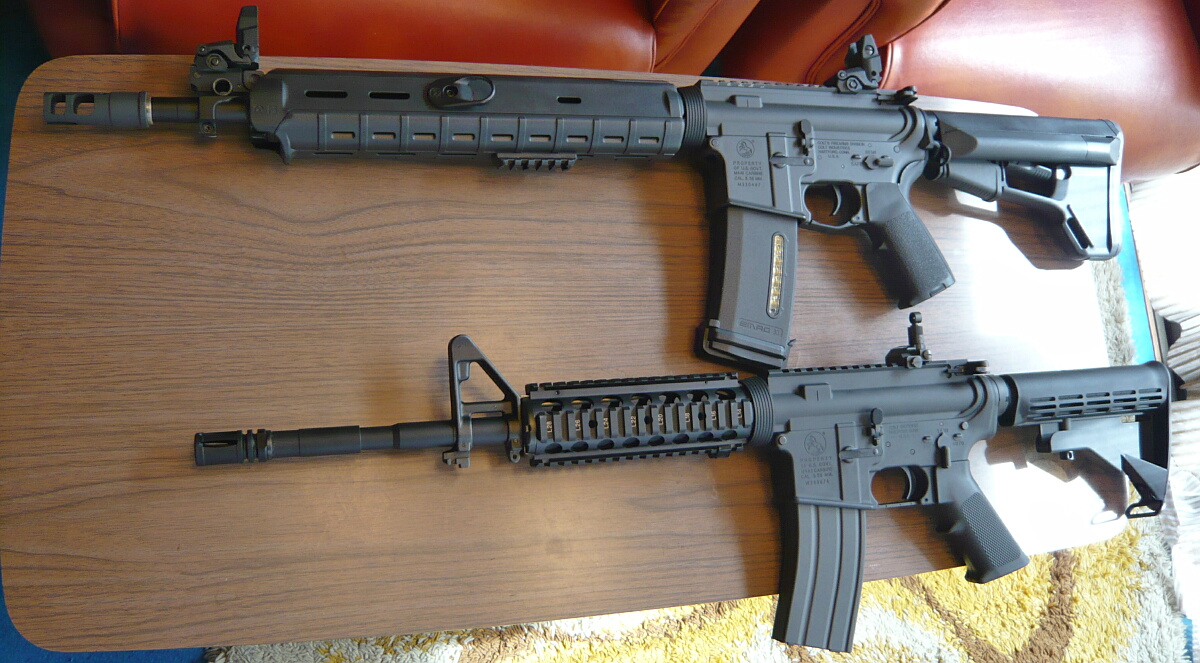 ふと全弾撃ち尽くすとボルトストップの掛かるM4が欲しくなりどんなのがあるか見繕ってみると、マルイのガスブローバックM4A1MWS、次世代電動ガンだとSOPMODバッテリーのものを除外すると素M4A1かHK416Cの3つ。素M4は今更な感じがするしキャリハンやハンドガードなどいらないパーツが多すぎる。HK416Cは短すぎるのと十字断面の持ちづらいレイルハンドガードを他のに換えられないので消去法でM4A1MWSになりました。マルイのガスM4は10インチバレルの短いモデルが出たら考えようと思っていたのですが、まあ待っていたらいつになるやらわかりませんし。