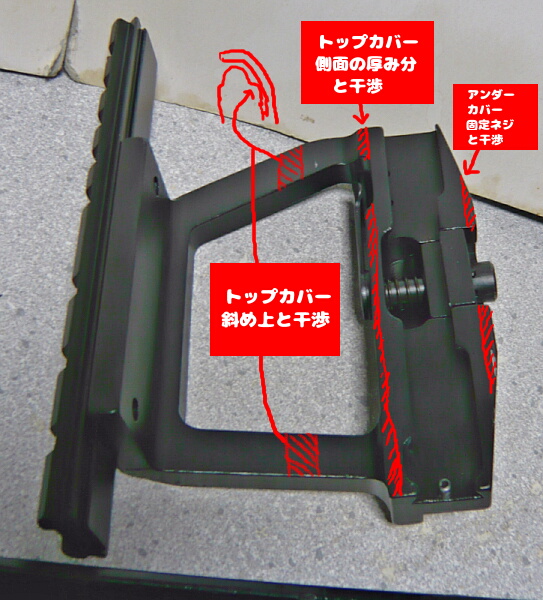 とりあえずウチのにはダメなので干渉していて削る必要がある部分が上の画像。トップカバー側面がレシーバー側面に掛かっている部分は厚み1.5mmくらいあるのでその分をまるまる削る必要があります。材質は亜鉛合金ぽいのですが、鉄ほどではないにせよ結構固いのでリューターと棒ヤスリでシコシコ削ります。