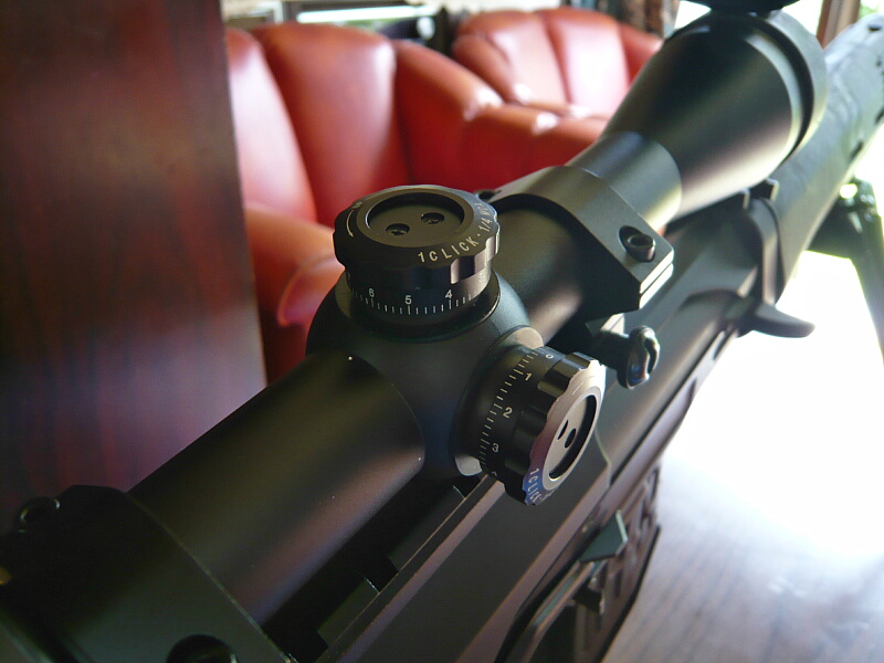 レティクルの調整は普通のスコープやドットサイトと同様に本体中央の上と右に突き出たダイヤルで調整します。このスコープのダイヤルはカキカキとした細かいクリックがあり、工具なしで普通に手で回す事ができます。上のダイヤルが上下、右のダイヤルが左右の調整ダイヤル。調整前の写真を撮り忘れたのですが、マウントとスコープはポン付け状態でレティクルに対し着弾位置がそこそこ中央に寄っていたので十分調整範囲内でした。