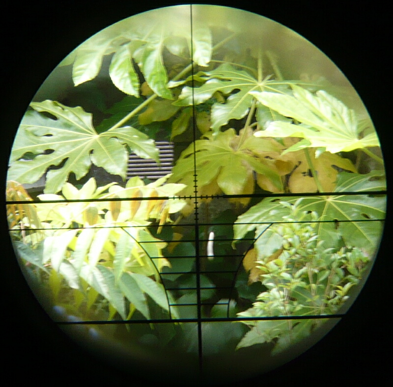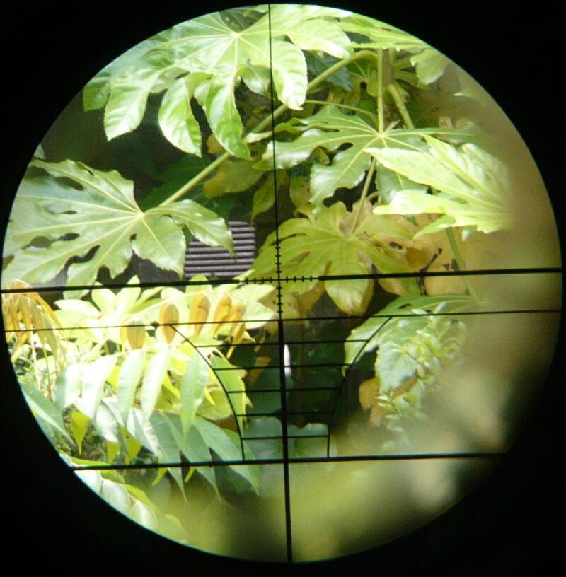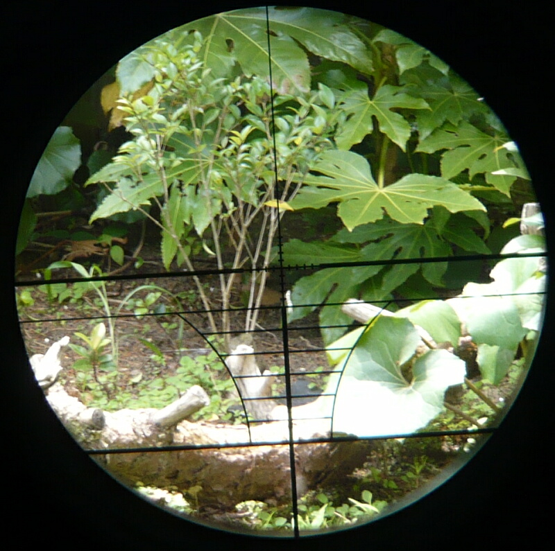 調整後、フルオート射撃しながらスコープの像を撮影したところ。連射中の一発の飛翔中を捉えた写真なので着弾位置はレティクル中央の若干上くらいに来ます。マウントがAK用なのでスコープ位置は銃に対して右にオフセットしているのですが、その割にはレティクル中心よりわずか右側に弾が見え、左右方向はほとんど調整していません。上下方向はレティクル中央より若干下に飛んでいたので中央に寄せていますが、ホップを強めると当然中央より上に飛ぶので、標的の距離とホップ強度の兼ね合いで大体の位置に調整するに留めます。ホップアップ機構のあるエアソフトガンの場合、ホップ強弱で上下方向のゼロイン位置は変わってしまうので、調整をしたらホップはいじらない事になります。しかしサバゲーの場合ゲーム前のパワーチェックでホップを動かされてしまうハズなので、チェック後に再調整するか、狙う前に1発スポット射撃するか、いっそ縦方向はアバウトに捉えるか、各々で考える必要があるでしょう。