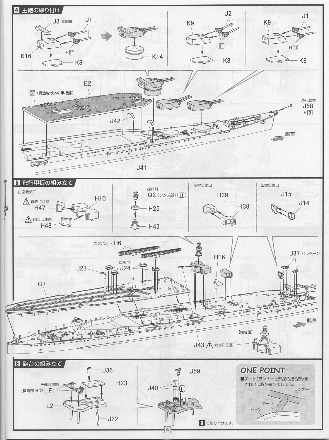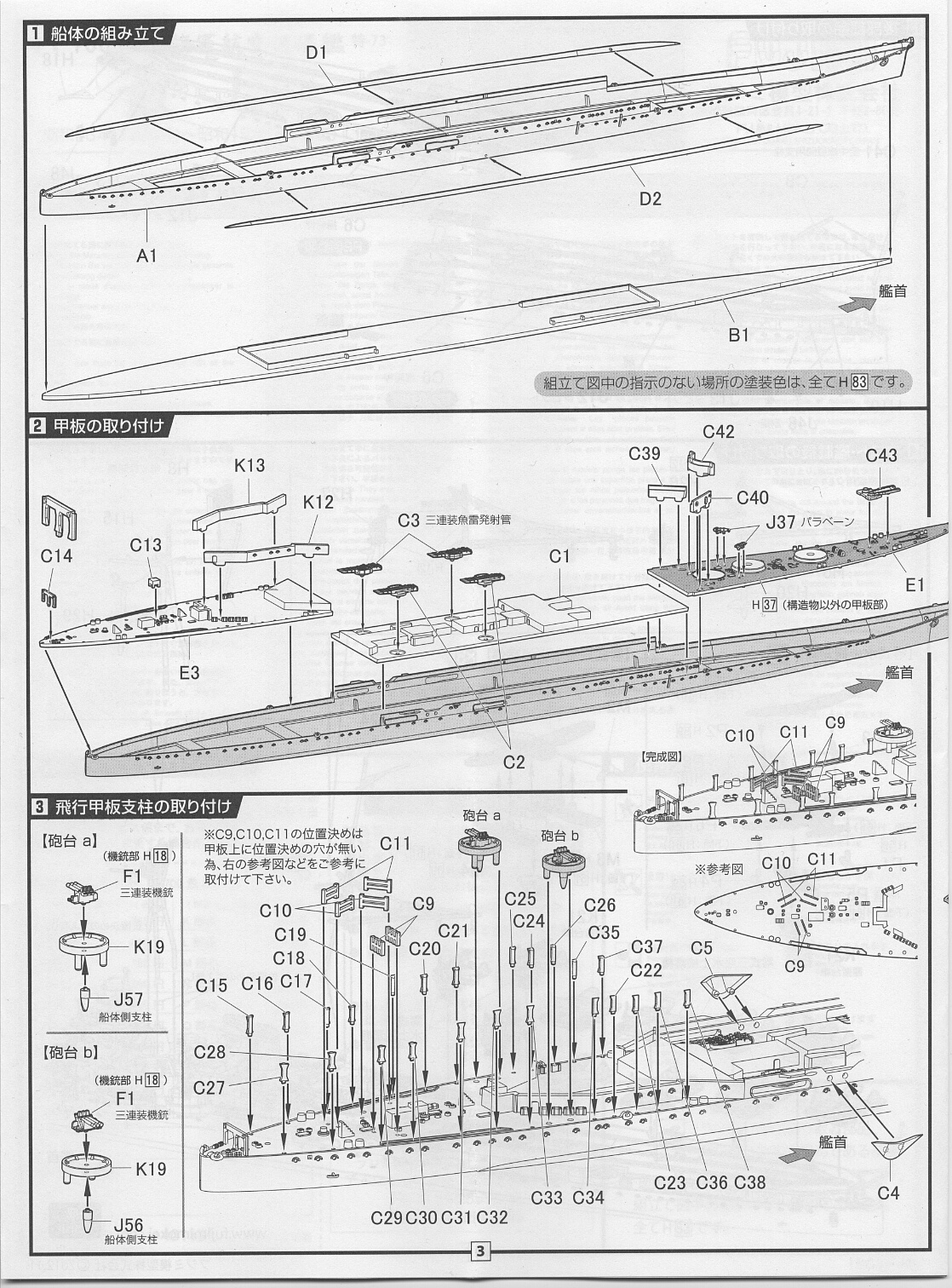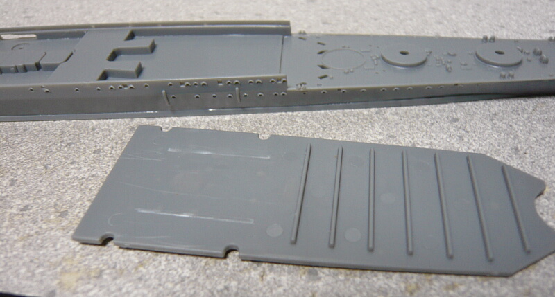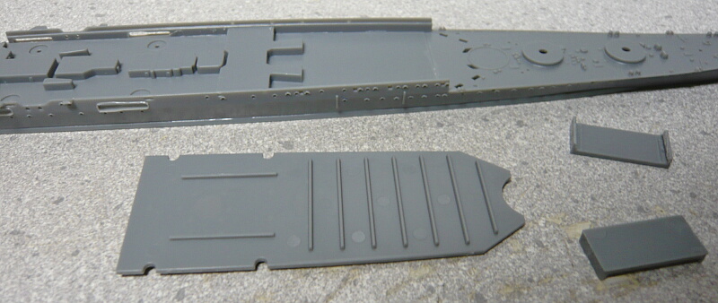 魚雷発射管を取り付けます。ゲート跡は見えない側になるのでレタッチしなくても十分。魚雷室は艦橋の載る甲板パーツの下というよりはそれより後ろの航空甲板の下になります。
