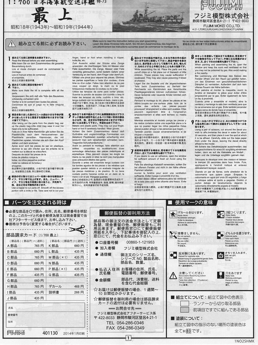 外箱は特シリーズの重巡や戦艦と同サイズ。最上のキットは92年頃にタミヤのものを組んだ事があるのですが、年代的にあれは今売られているものではなくリニューアル前のものでしょうか。当時は「重巡の後ろ半分が空母になってるやつ」くらいの認識しかなかったのであまりキットの特徴を覚えていないのですが、淡々と普通に組めてしまって印象に残らない程度には難易度の高くないキットだったのだと思います。そしてこの特-73最上はタミヤのものが2002年頃に現在のキットにリニューアルされた更に10年後の2012年のキット。さてどんなものか。