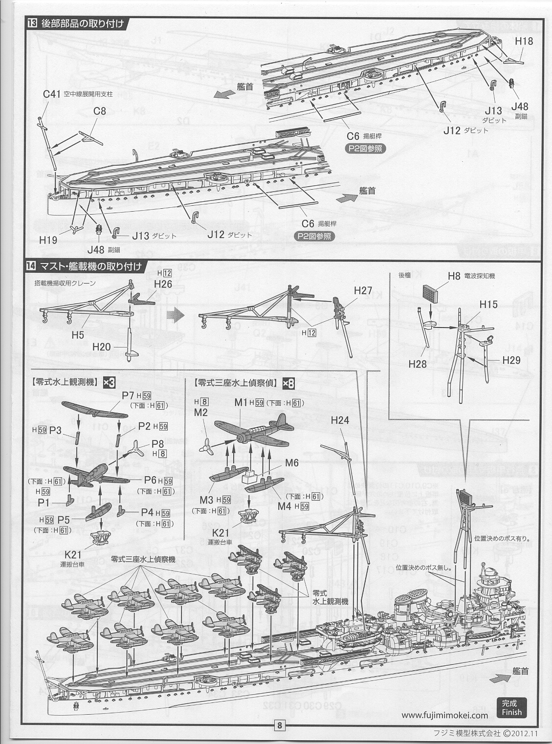 Pは零式水上観測機(ZEROKAN)、Mは零式三座水上偵察機で、ランナー1枚に2機ずつあります。