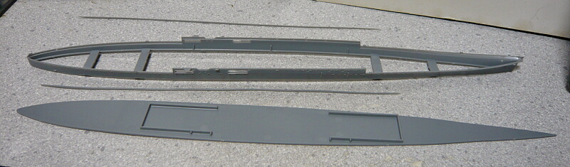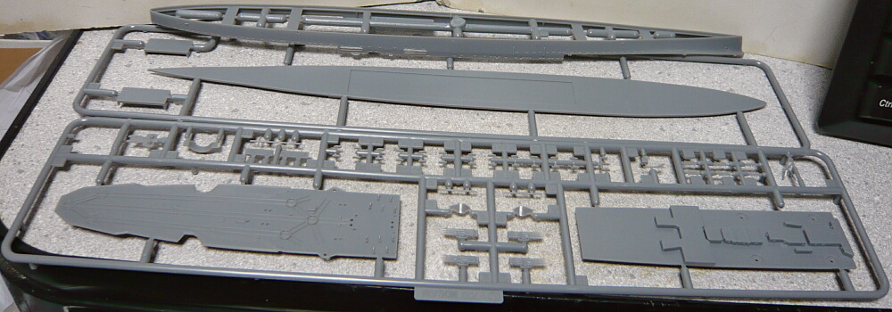 それでは製作開始。船体はまず側面と艦底パーツの結合から入りますが艦底パーツは側面に露出せず、艦底色を塗らないフジミ特に多いパターン。細いパーツはバルジの上端にあたるパーツで、向きが分かりづらいですがパーツ番号とダボとダボ穴の位置を読み間違えなければ問題ありません。