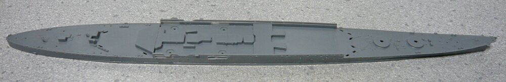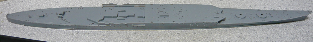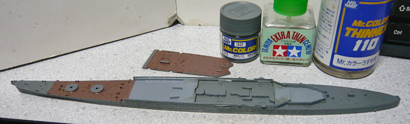前後の甲板と、艦橋の載る甲板の一層下のパーツを乗せます。一層下のパーツはこれだけ造形してあるのに魚雷の出る穴からしか見えなくなるので少し勿体ない感じがします。