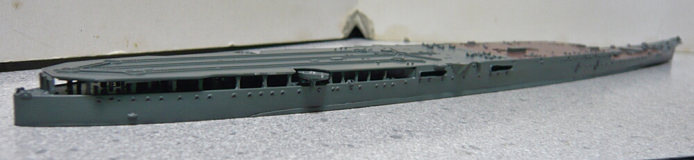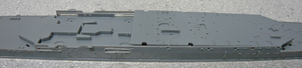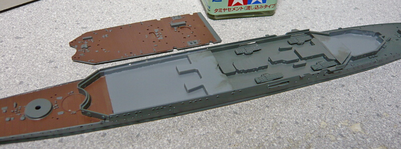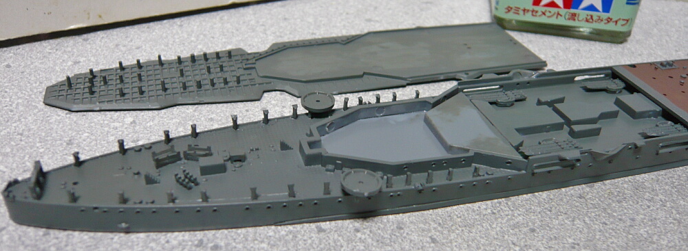 艦橋が載る甲板と、航空甲板を乗せます。航空甲板下の中央付近は流し込み接着剤の筆が届きにくいのでここだけは普通の接着剤を盛ってから合わせた方が作業性が良いでしょう。