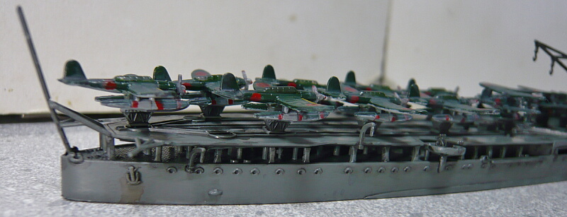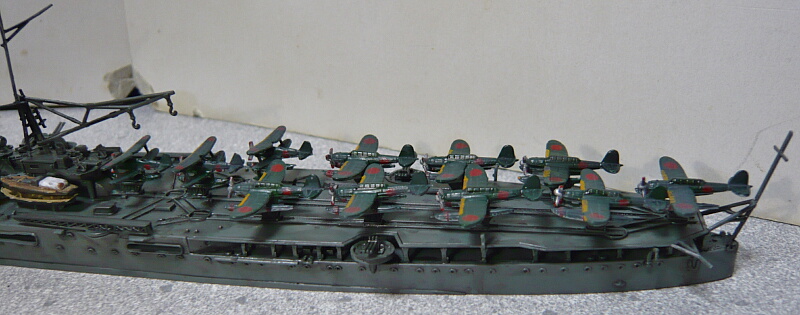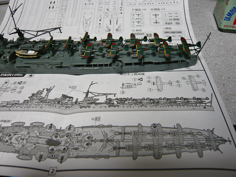 機体を運搬台車に載せ、航空甲板上に置きます。ゼロ観のフロート下にはダボ穴が無いので運搬台車の上側のダボを切り飛ばして上面に前後方向の溝をヤスリで軽く掘ってやると取り付けやすいでしょう。説明書通りに配置しようと後ろ側から並べてゆくと前から2番目のゼロ観がレール上に収まらなくなるので並びをアレンジする必要があります。また最上の水上機の搭載数11機は定数であって実際にはゼロ観3・ゼロ偵4の計7機だったそうなので、その数にしておいた方がスマートかもしれません。