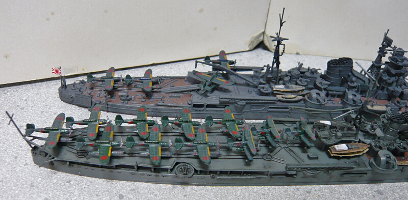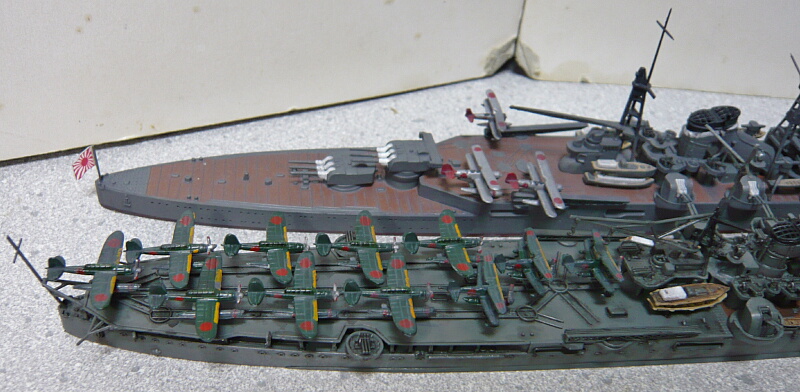 同様に航空甲板が増設された伊勢型戦艦・伊勢。伊勢型航空戦艦は偵察重視の最上とは違い、搭載機が瑞雲や彗星など爆撃機が主体の攻撃用途であったためか本格運用の機会に恵まれず、また搭載予定であった航空隊の転出もあり航空機を搭載しての実戦すら無く、大きな容積の格納庫を利用した輸送船的な利用が目立ちました。それでもやはり同様に航空機を格納するハズだった格納庫を荷物庫にされた軽巡洋艦大淀と共に北号作戦では無傷で資源を本土に持ち帰るなどの活躍を見せました。