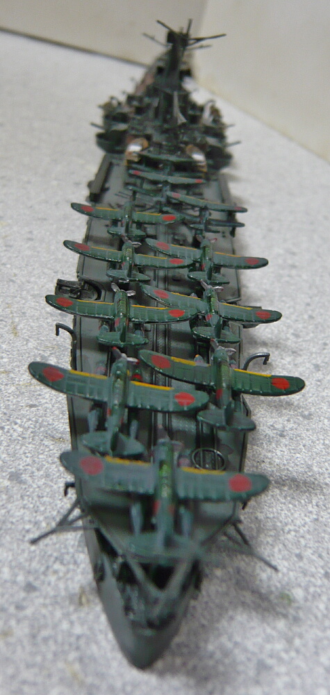 再び艦前方。前マスト上には特徴的な21号電探が装備されています。機銃装備は竣工時に25mm連装4基と13mm連装2基だったものが全て25mm三連装に交換され、後マスト後ろと航空甲板両舷に4基追加して合計10基となりました。1944年の呉での修理後は更に単装機銃が多数置かれていたようです。