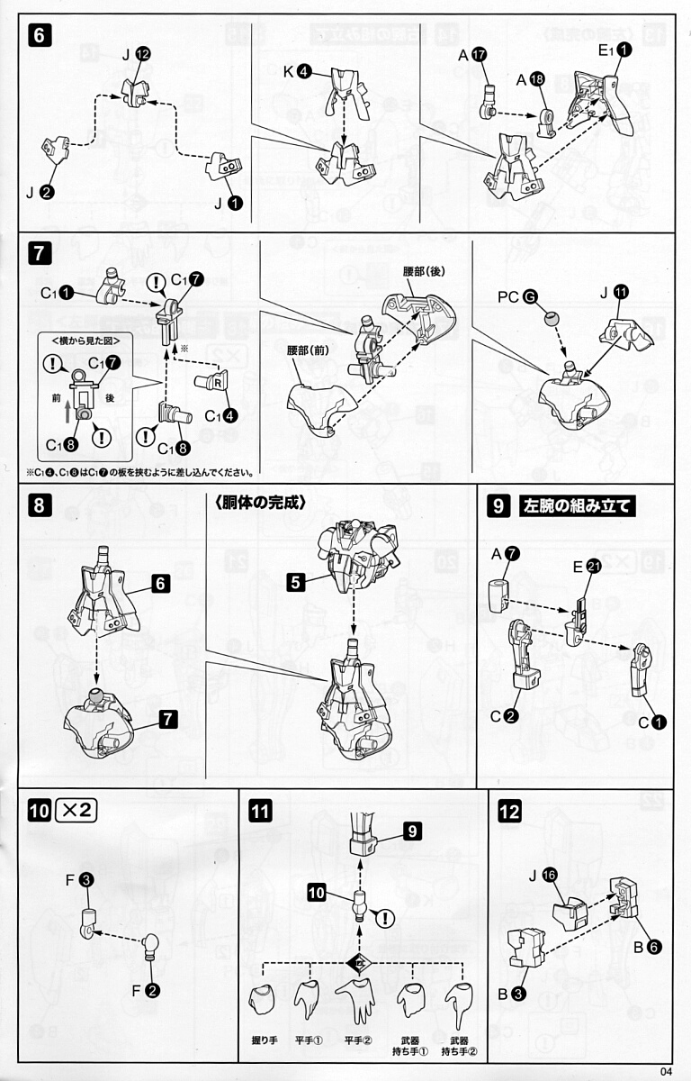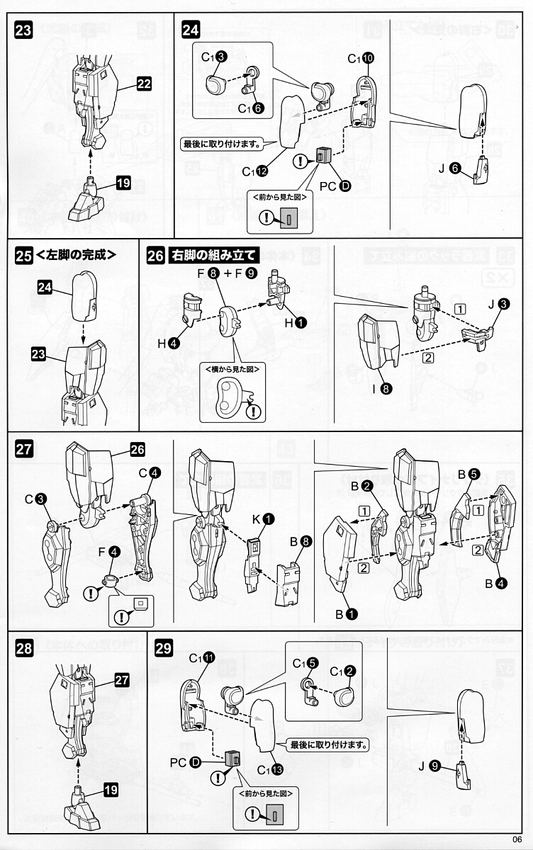 説明書。デジカメ撮影のが読みづらくて加工も面倒だったので仕舞ってあったスキャナでスキャンしてみました。読み取り設定を覚えてくれず一枚一枚設定しなきゃいけなくて面倒臭いのは変わらなかったもののいくらか読みやすくなっただろうか?5ページ目の中段、J21のパーツ形状が実際と違うのでJ21の下の足を切り飛ばしてダボ穴にそのまま乗せる取り付けにすると良いでしょう。