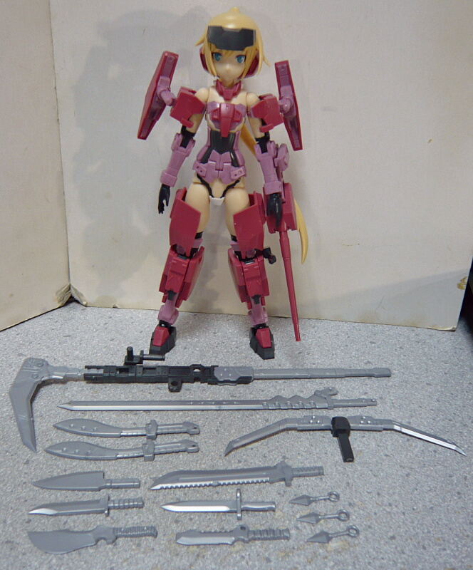 残りのパーツを組みつけ、並べたところ。刃物が主で持ちきれないほどあります。