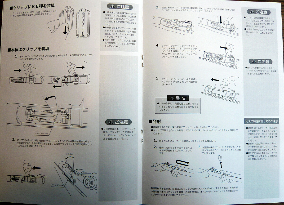 ボルトストップが掛かったままでボルトが前進しない事がよくあります。その時はボルトを一旦引くかクリップラッチを押してクリップを排出し、ボルトハンドルを前方へグッを押してからボルトハンドルをいっぱいに引いてリリースし、ボルトストップを解除して装填作業をやりなおします。ね?難物でしょ。本当、なんじゃコレ…