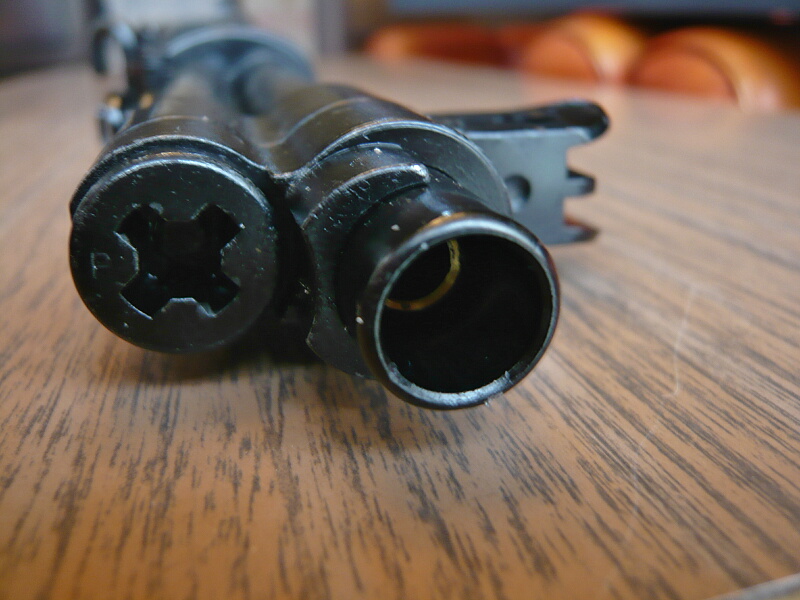 各部を観察。銃口は時代的にフラッシュハイダーなどは無く、銃本体の大柄な印象からすると小さく感じます。2cmほど奥に真鍮製のインナーバレルが見えます。