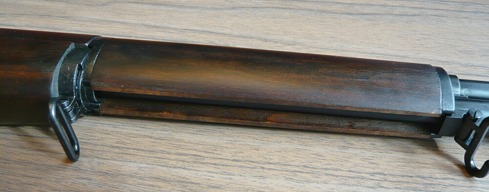 ハンドガード前半部分。短小モデルの「タンカー」ではここが半分以上縮められていますが、これは標準モデルなのでスラリと長いです。下側は覆われておらずアウターバレルが露出しています。ここの前端と後端にそれぞれスリングスイベルが付いています。