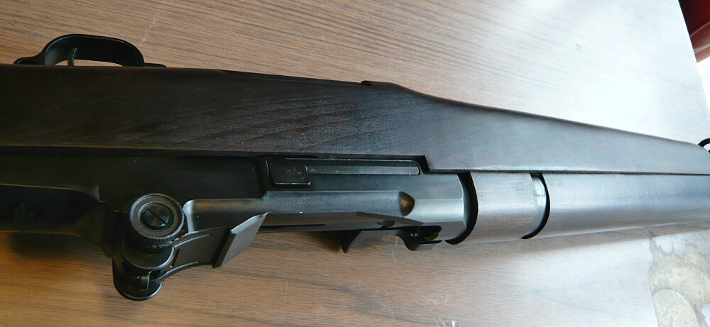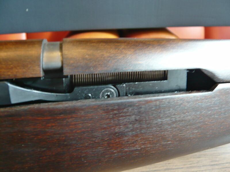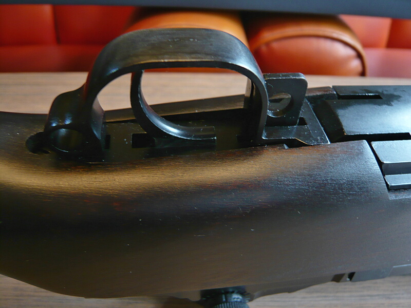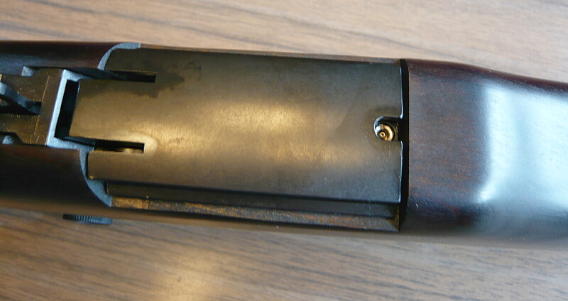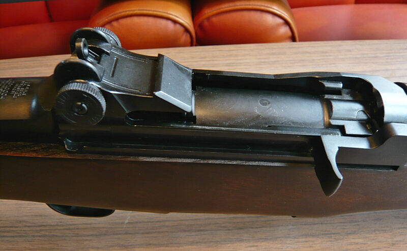 レシーバー上部。M14のレシーバーから右後方のセレクターを無くしたような印象。M14自体はこのM1ガーランドをマガジン式にして使用弾を30-06から.308に変えてフルオート可能にしたようなもの。
