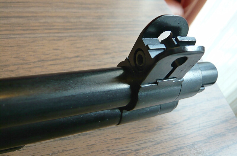 フロントサイト。レールに横から差し込んでネジで固定されています。左右調整の他、傾き調整も出来るようです。上写真の左端下端辺りに着剣ラグがあります。