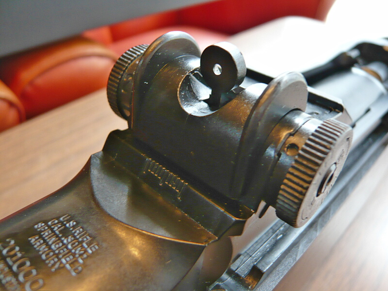 リヤサイト。M14と同様のもので上下左右の調整をダイヤルで行う事ができます。ダイヤルは引っ張って回し、離して固定という操作。右が左右、左が上下。