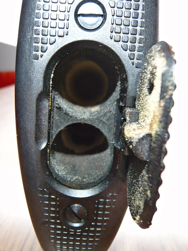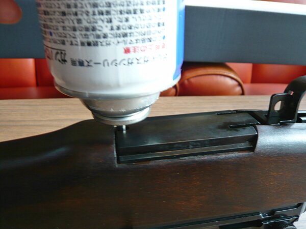 それでは実射にとりかかるためガスを注入しますが、この銃ではハンマーが倒れている時はバルブを押しっぱなし状態になるらしく、ガスを注入した先から抜けていってしまいます。必ずボルトハンドルを引いてハンマーを起こした状態で注入します。ガスを入れ過ぎると気化スペースが足りず生ガスを吹くそうなので加減が難しい。またガスが入っている状態ではハンマーを倒す事ができないので仕舞う時はハンマーが起きた状態でセーフティON(ハンマースプリングがヘタるので非推奨)か、もしくはガスを使い切らなければなりません。