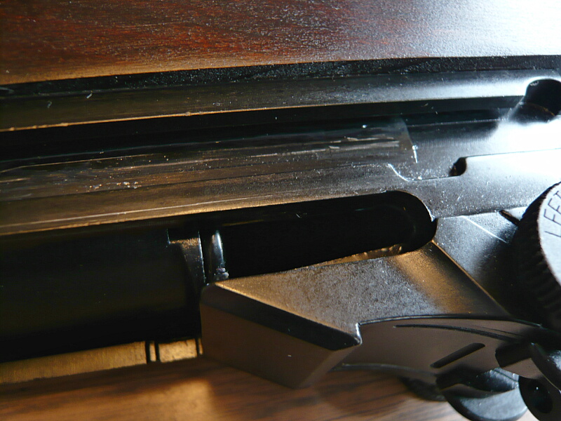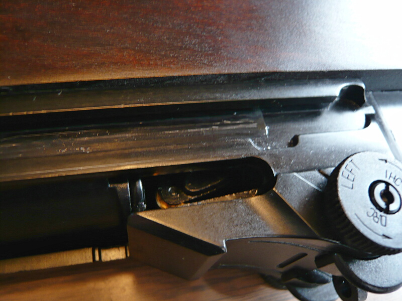 ボルトが閉鎖している時はボルトの右後方の隙間からハンマーの状態が窺えます。上写真はハンマーが倒れている状態で、ハンマーが見えています。