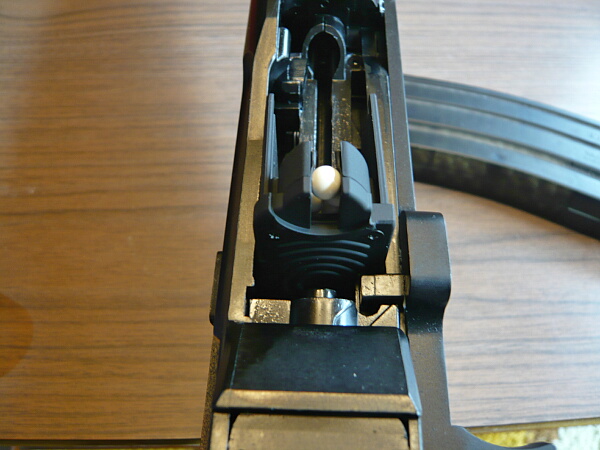 後方にノズル、中央から前方にかけて給弾ルートがあります。その間の空間にクリップが入り、ボルトに固定されているノズルが前進するとともにクリップからBB弾が給弾ルートを1発ずつ通って前方のチャンバーに送られます。
