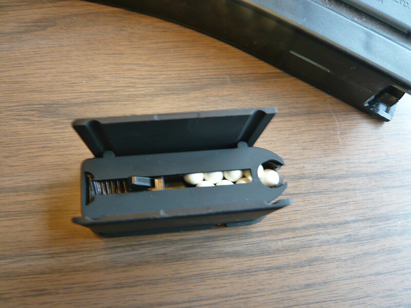 ロックが掛かるまで押し込みます。上写真では律儀に実銃での作法としてチョップでボルトハンドルを止めながら押し込んでいますが、止めなくてもボルトの前進する力が弱いし、クリップが中々スムーズに入って行かないのでそんな余裕もありません。