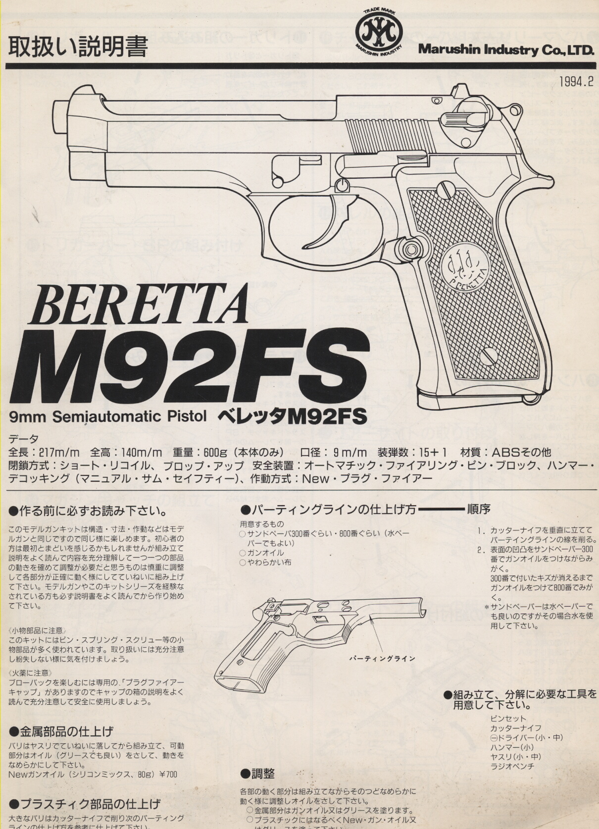 まずはマルシンのモデルガン、ベレッタM92FSのマニュアル。組み立てキットのもので、これは現在も銃本体は現存。